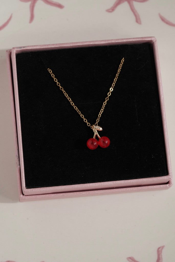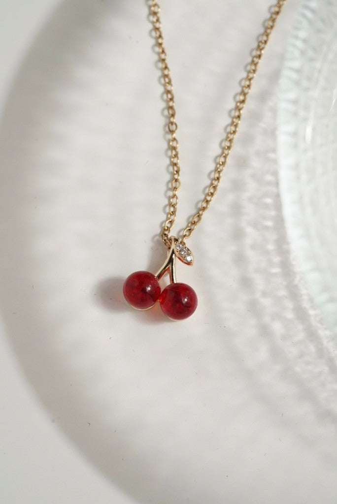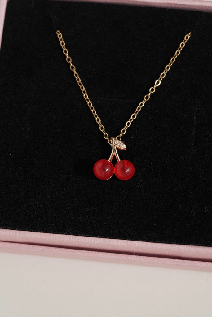 çelik kiraz kolye, kırmızı charm kolye, meyve figürlü kolye, modern çelik kolye, zarif kadın kolye, renkli charm kolye, dikkat çekici kolye, paslanmaz çelik kolye, genç stil takı, yazlık kolye