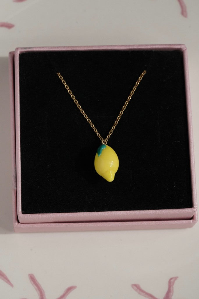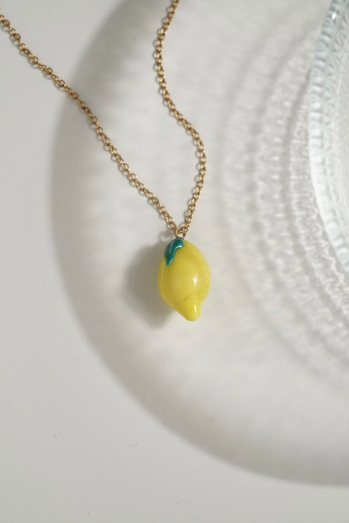 çelik limon kolye, murano cam kolye, meyve figürlü kolye, sarı charm kolye, yazlık kadın kolye, modern tasarım kolye, limon figürlü takı, zarif çelik kolye, paslanmaz çelik kolye, renkli charm kolye