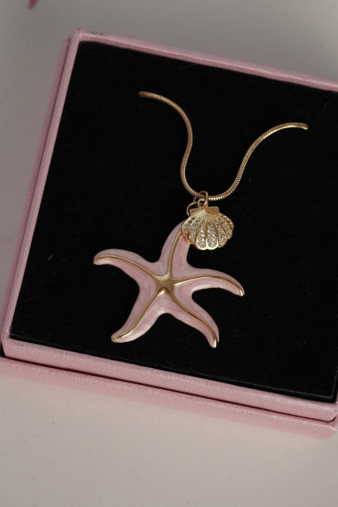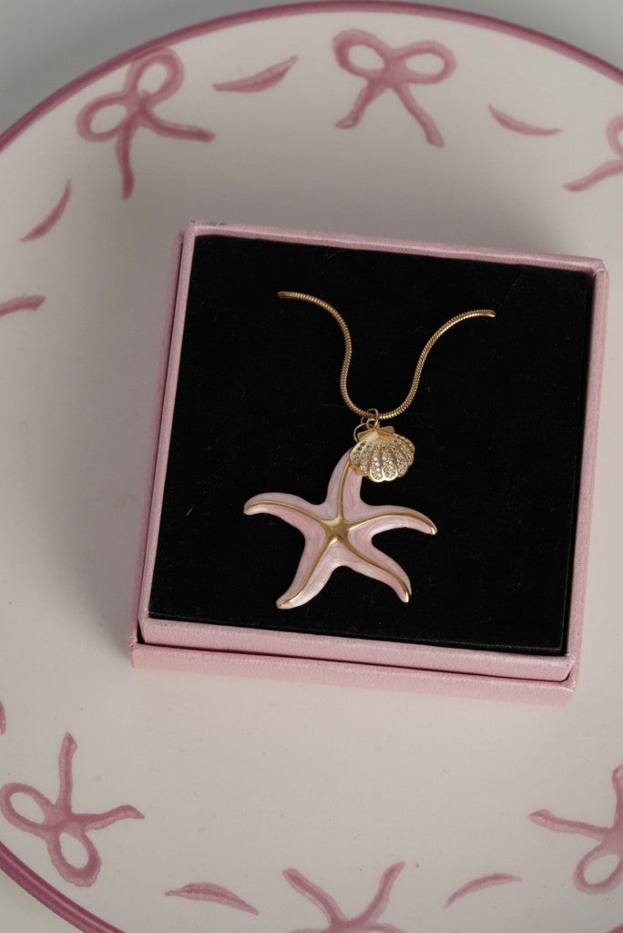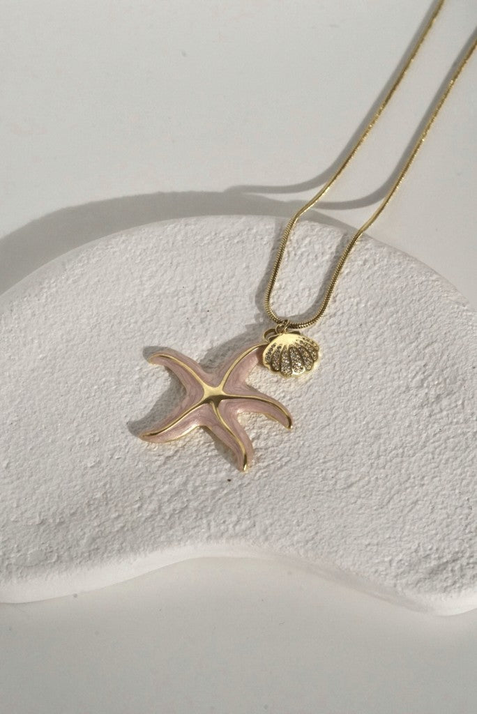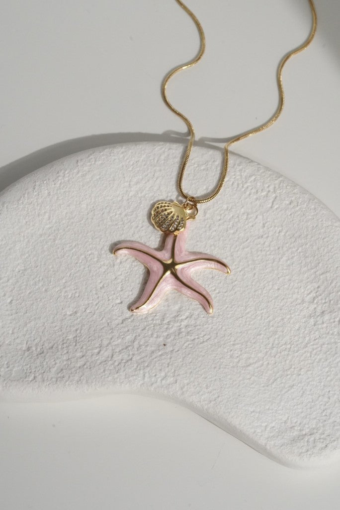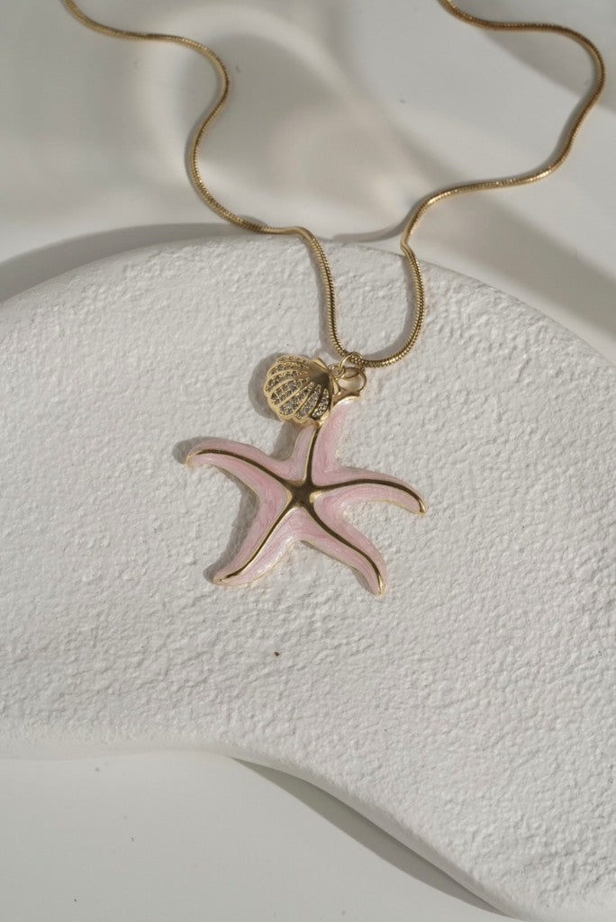 çelik deniz yıldızı kolye, pembe charm kolye, deniz temalı çelik kolye, zarif çelik kolye, yazlık kadın kolye, modern charm kolye, pembe deniz yıldızı takı, dikkat çekici kolye, paslanmaz çelik kolye, tatil takısı