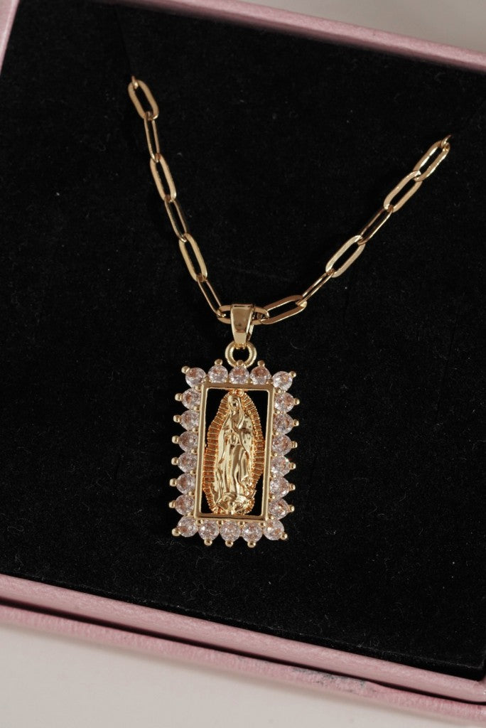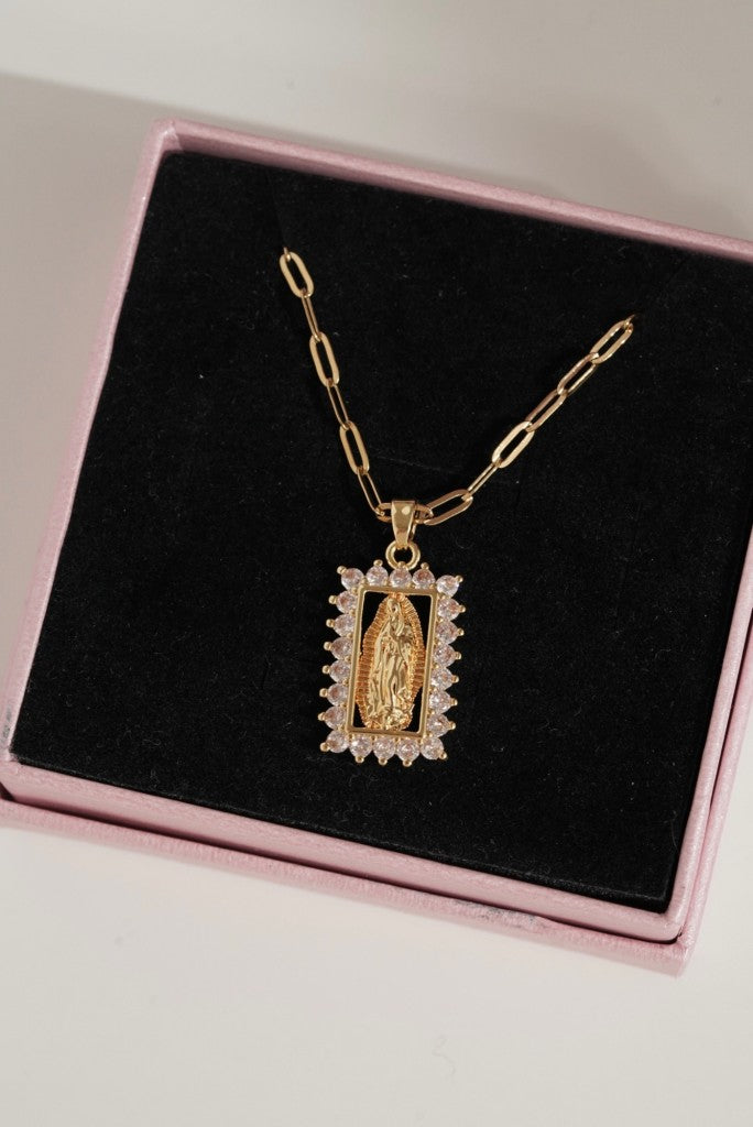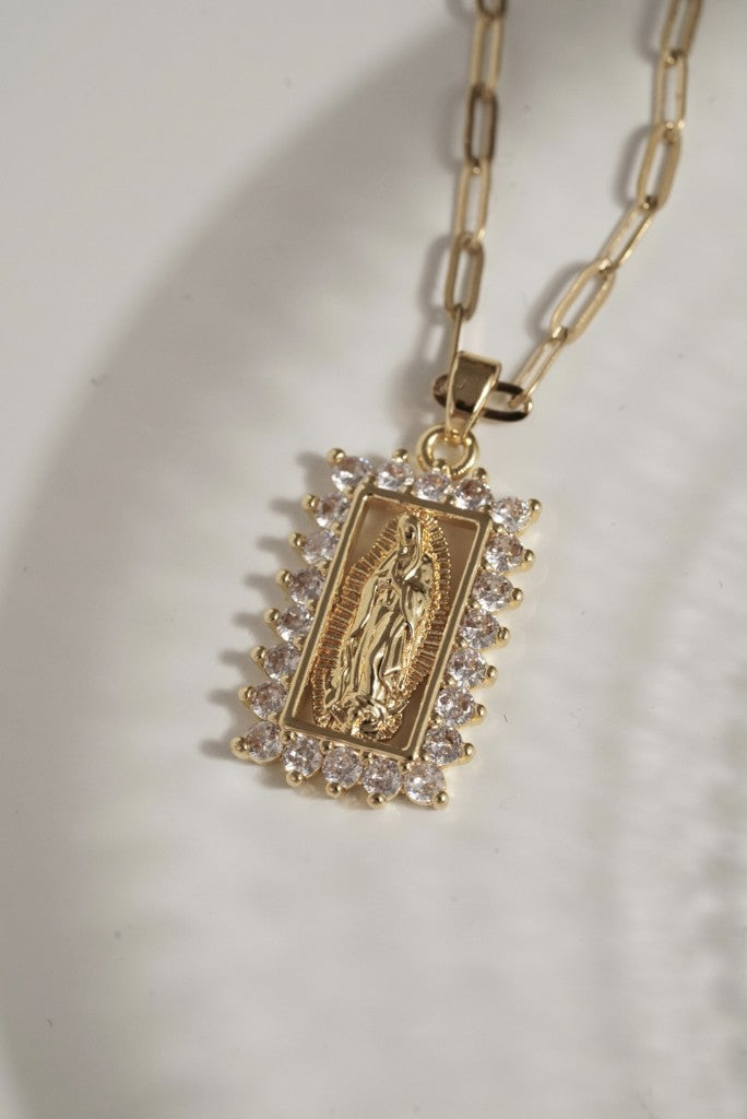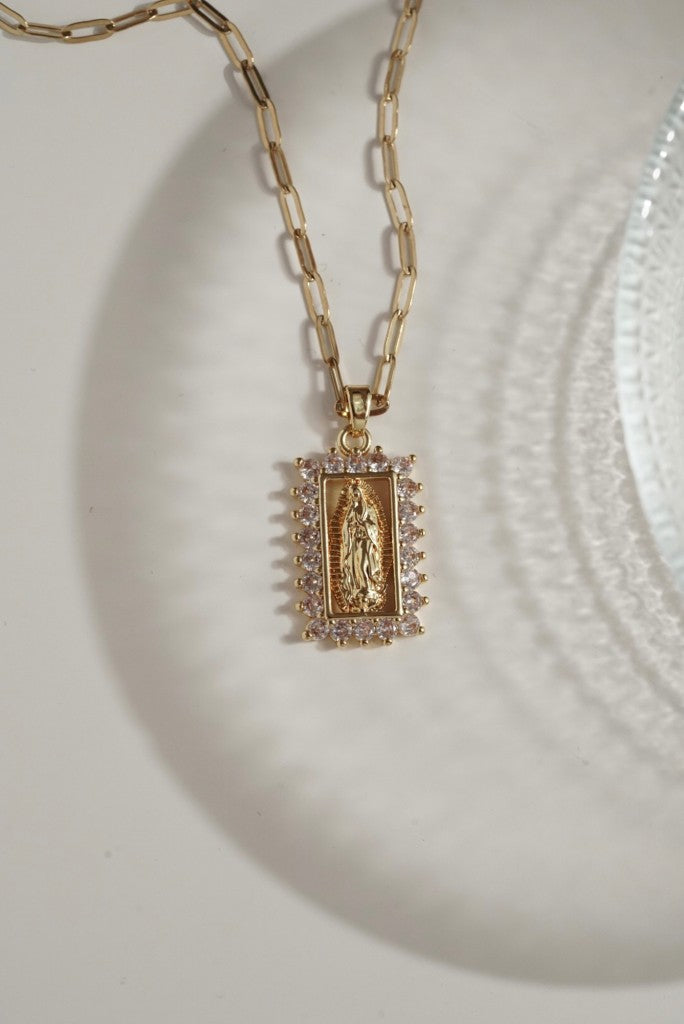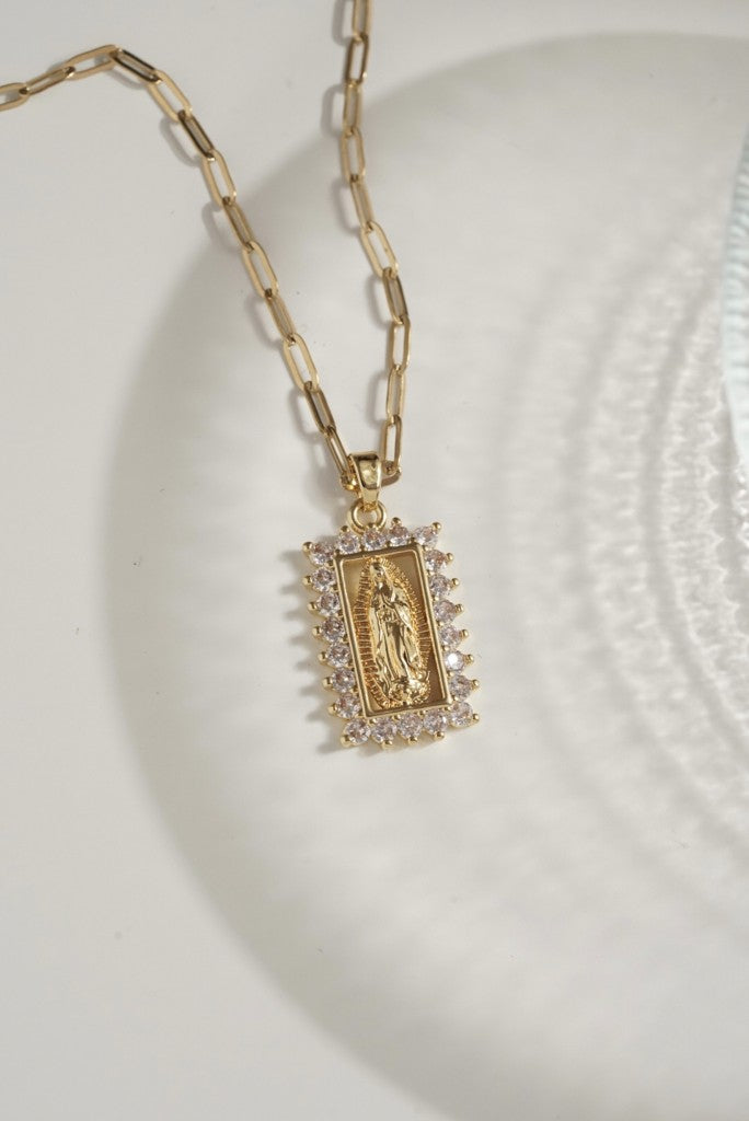 çelik Meryem Ana kolye, taş detaylı kolye, dini figürlü kolye, anlamlı kolye, zarif çelik kolye, manevi takı, modern kadın kolye, dikkat çekici kolye, paslanmaz çelik kolye, özel tasarım kolye