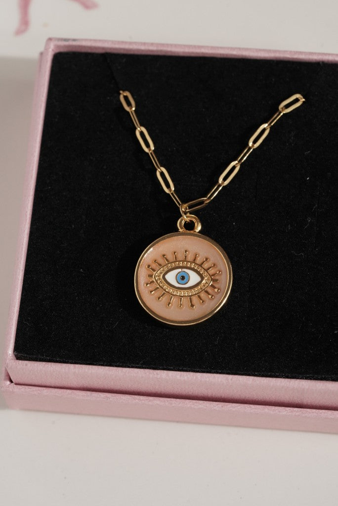 çelik nazar kolye, göz figürlü kolye, yuvarlak nazar kolye, paslanmaz çelik kolye, koruyucu sembol kolye, zarif kadın kolye, modern tasarım kolye, dikkat çekici çelik kolye, anlamlı figürlü kolye, şık aksesuar