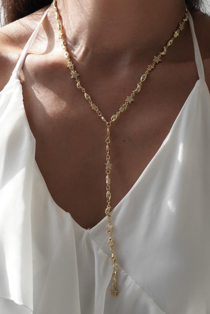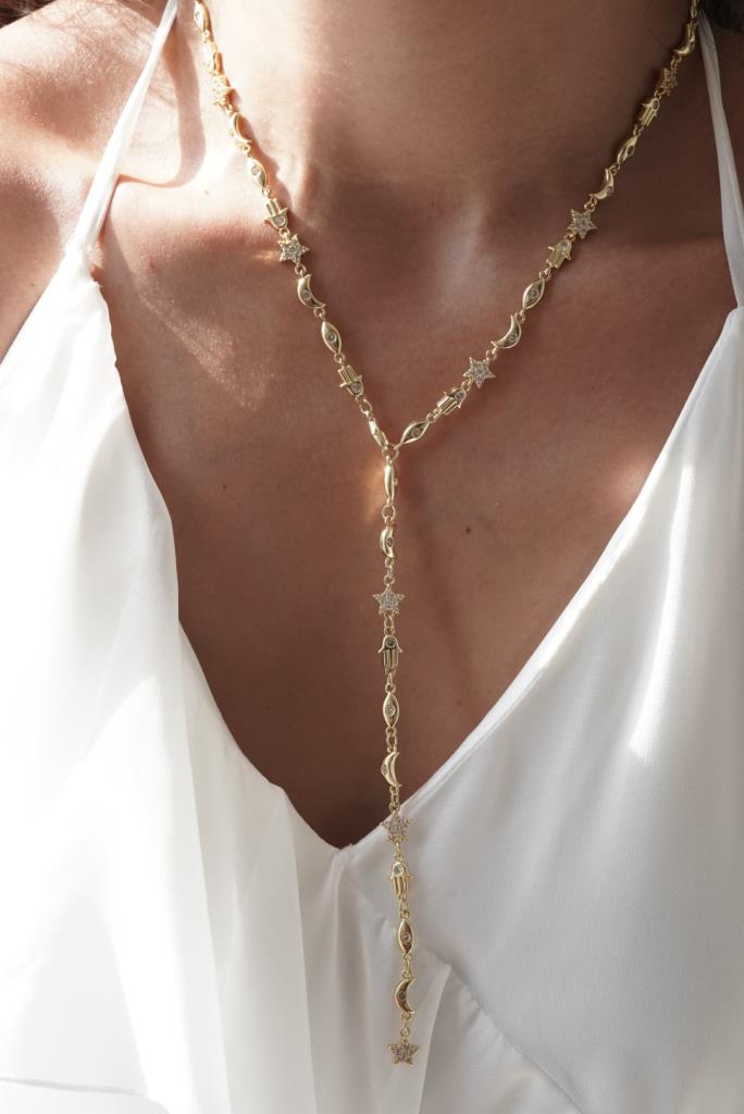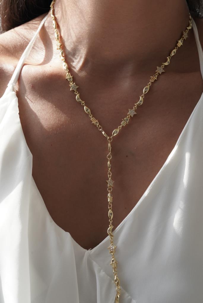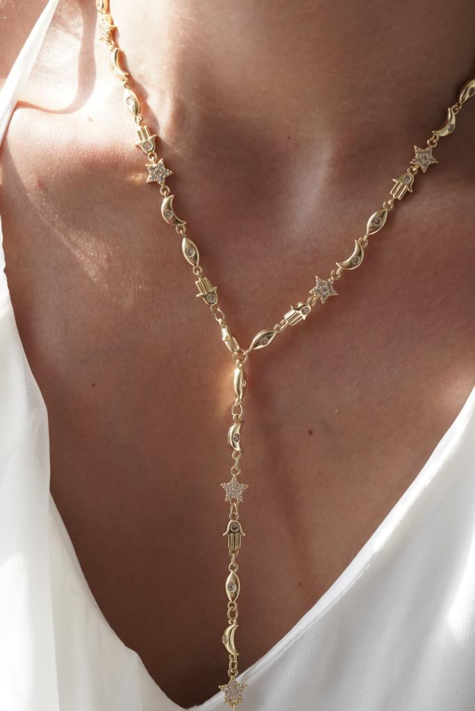 Hamsa kolye, Y kolye, Hamsa figürlü kolye, zarif kolye, şık kolye, özel tasarım kolye, nazar boncuğu kolye, modern kolye, spiritual takı, koruyucu takı.