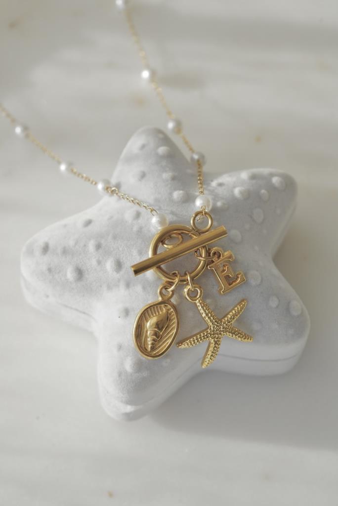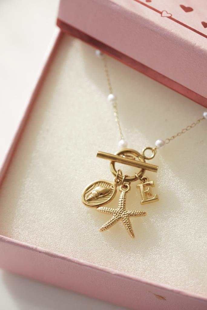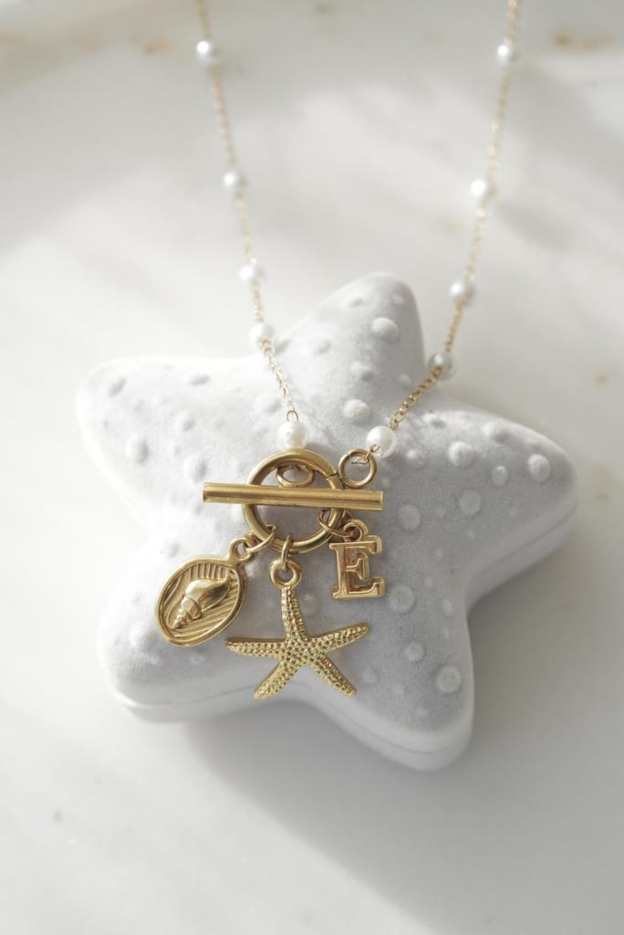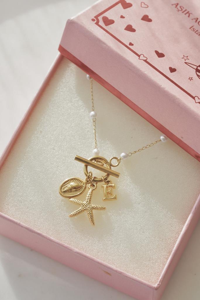 incili charm kolye, deniz temalı kolye, harfli kolye, kişiye özel kolye, deniz figürlü kolye, deniz kabuğu kolye, altın kaplama kolye, zarif inci kolye, yazlık kolye, özel tasarım takı, kişiselleştirilebilir kolye, deniz yıldızı kolye, şık kolye, günlük kolye