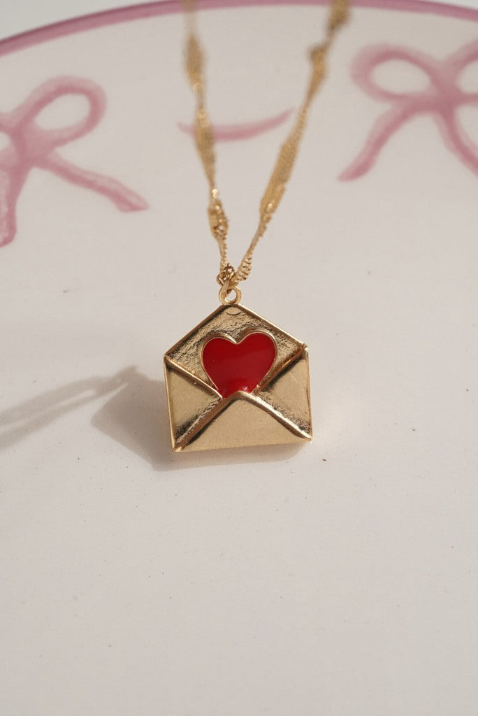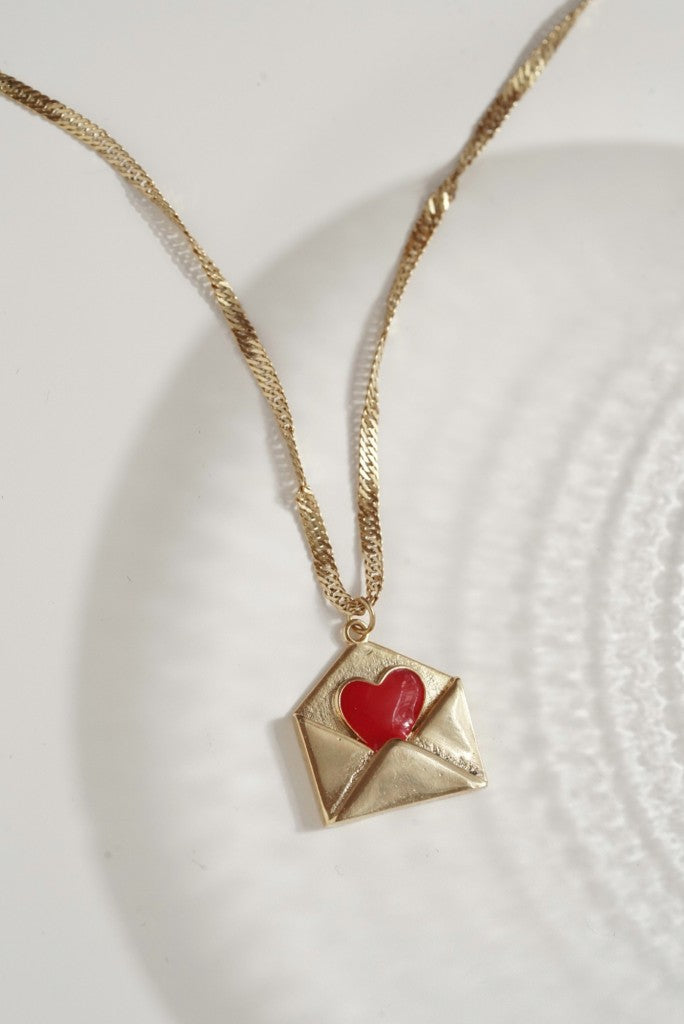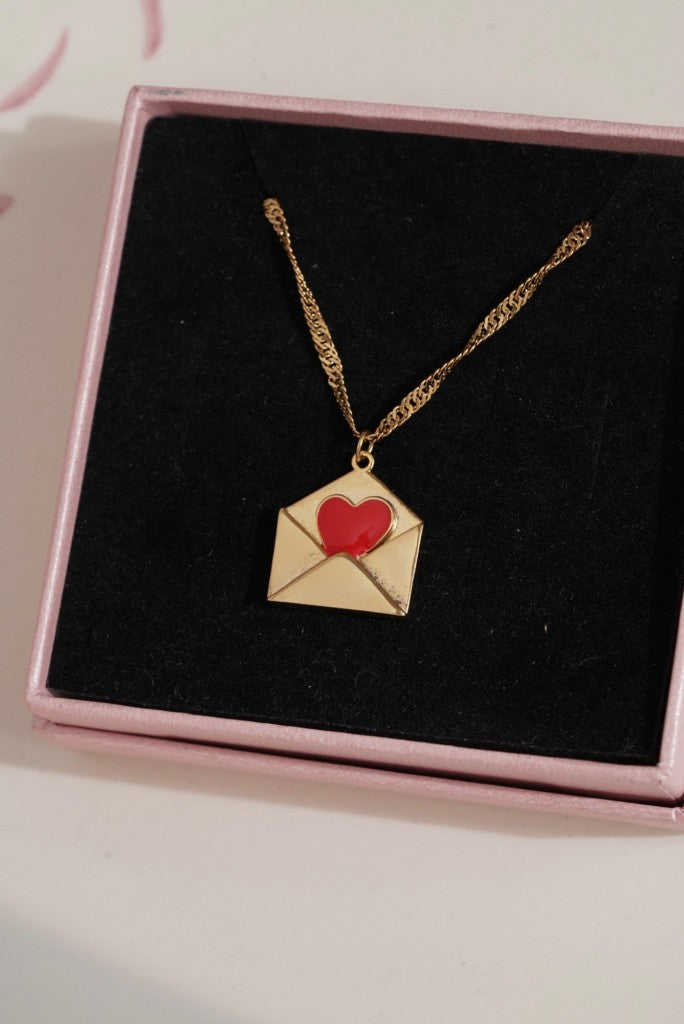 Kırmızı Kalp Detalı Zarf Çelik Kolye