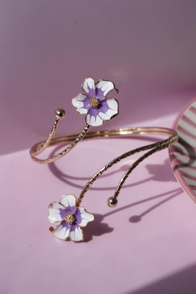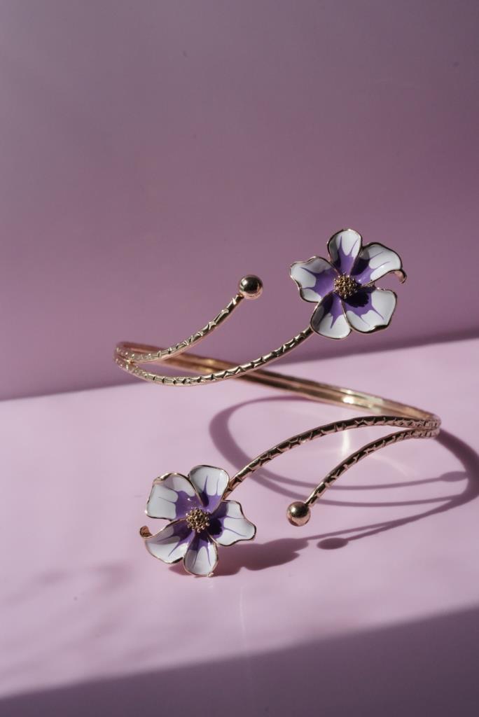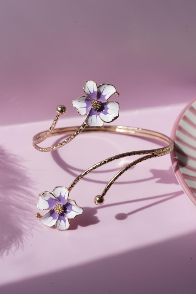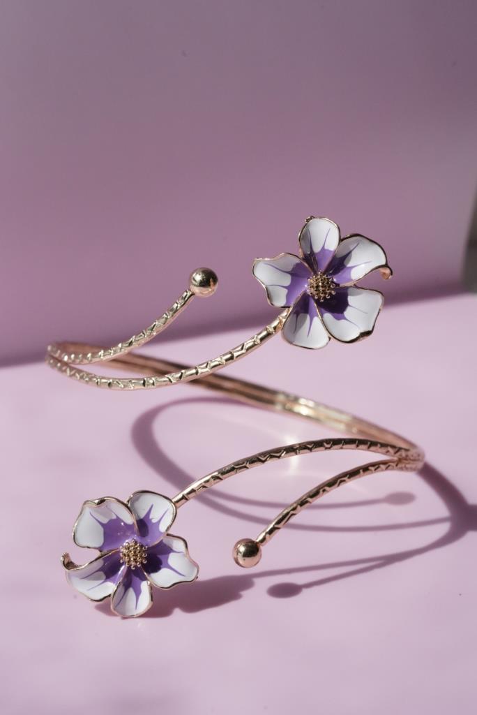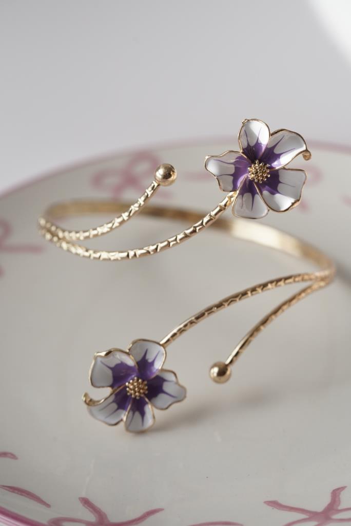 mor çiçekli bilezik, çiçek figürlü bilezik, zarif bilezik, şık bilezik, modern bilezik, çiçekli takı, özel tasarım bilezik, zarif takı, mor takı, şık takı.