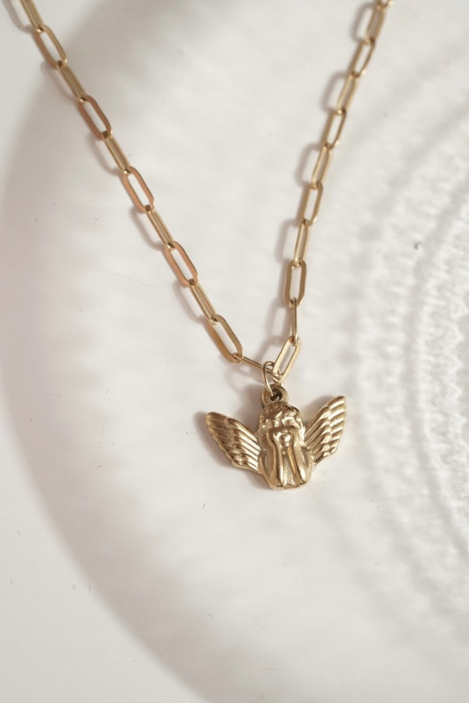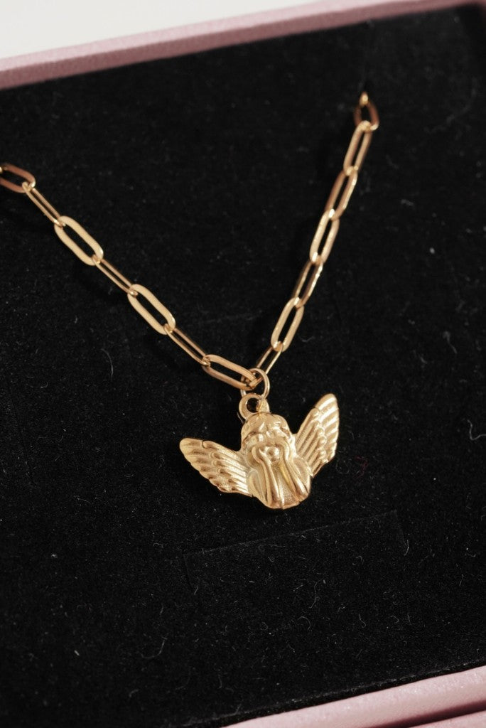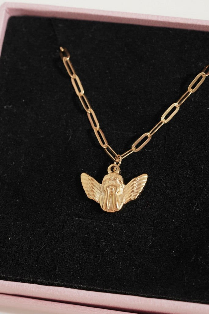 paslanmaz çelik melek kolye, melek figürlü kolye, anlamlı kolye, zarif çelik kolye, dini sembol takı, özel tasarım kolye, dikkat çekici çelik kolye, paslanmaz çelik takı, manevi figürlü kolye, modern kadın kolye