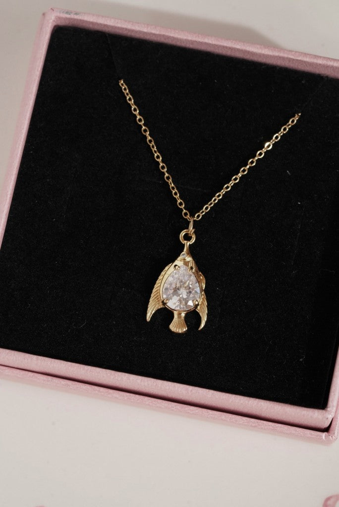 çelik balık kolye, taşlı balık kolye, deniz temalı kolye, paslanmaz çelik kolye, zarif kadın kolye, taş detaylı çelik kolye, dikkat çekici kolye, denizden ilham alan takı, yazlık kadın kolye, modern tasarım kolye